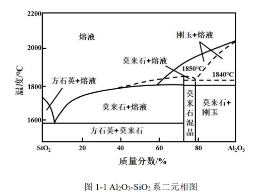 耐火澆注料是由一定級(jí)配的骨料、細(xì)粉、結(jié)合劑和外加劑按一定比例組成的耐火混合料,因其具有生產(chǎn)工藝簡(jiǎn)單、生產(chǎn)周期較短、節(jié)能等優(yōu)點(diǎn)被廣泛使用。 高鋁系列耐火澆注料是由 Al2O3和SiO2作為基本化學(xué)組成的耐火澆注料。高鋁系列耐火澆注料的相組成可以從 Al2O3-SiO2 系相圖得到。從圖1-1可以看出,Al2O3的熔點(diǎn)為2050 ℃,SiO2的熔點(diǎn)為1723 ℃。在該系統(tǒng)中,唯一穩(wěn)定的二元化合物為莫來石,其化學(xué)組成為3Al2O3·2SiO2(Al2O3為71.8%,SiO2為28.2%),莫來石的熔點(diǎn)為1850 ℃。由于莫來石的存在,系統(tǒng)被劃分為兩個(gè)子系統(tǒng):SiO2-莫來石子系統(tǒng),固化溫度為1595 ℃,共晶點(diǎn)組成接近SiO2一側(cè),以及Al2O3-莫來石子系統(tǒng),固化溫度為1840 ℃,共晶點(diǎn)組成接近Al2O3一側(cè)。